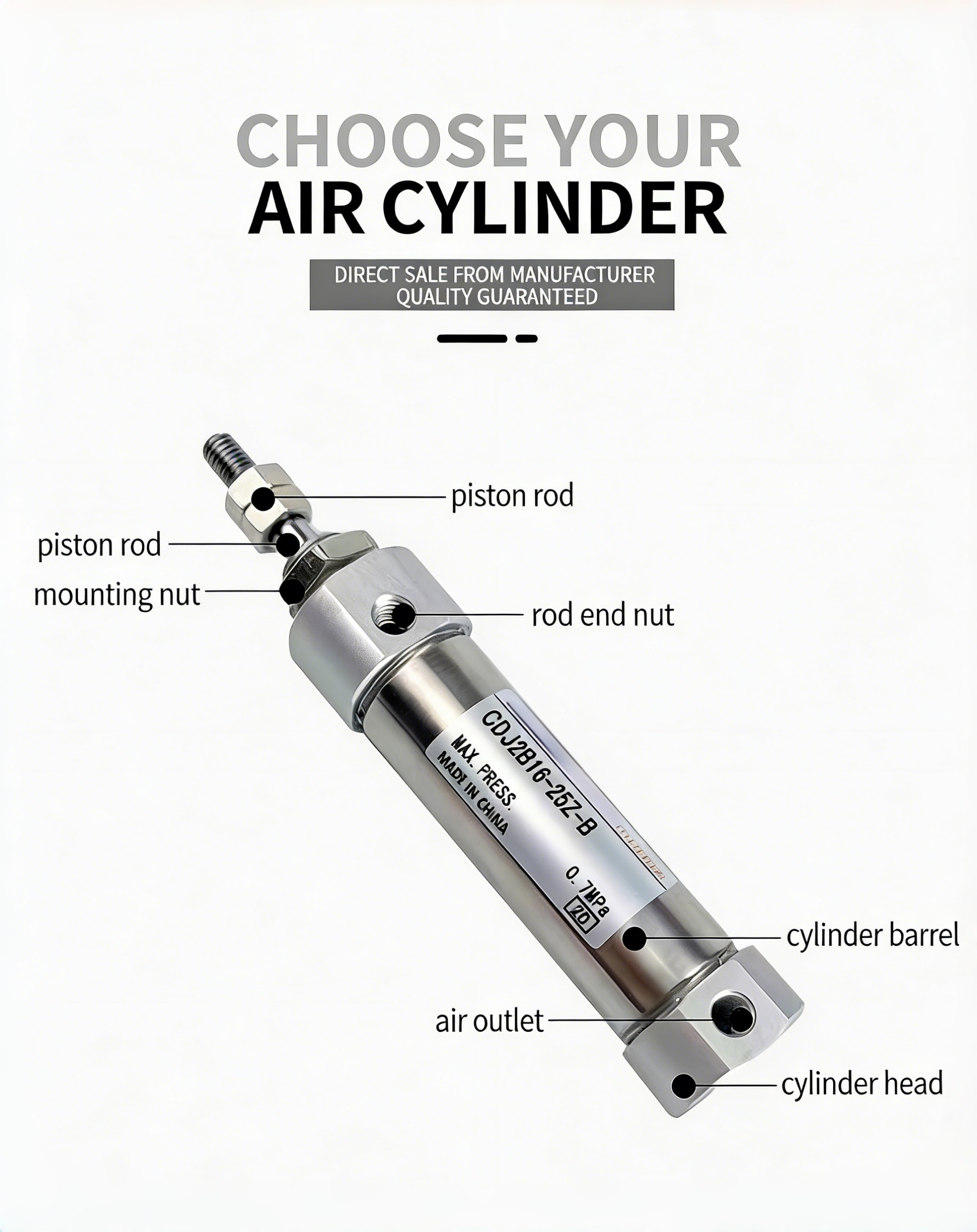 Building on these proven advantages, our CD2JB cylinders are further enhanced through the use of high-quality materials and advanced processing technology. This ensures superior sealing and durability while extending service life under continuous operation. In addition, we provide a wide range of specifications with customizable stroke lengths and multiple bore sizes, making it easy to adapt to diverse applications such as automation equipment, packaging machinery, and assembly lines.